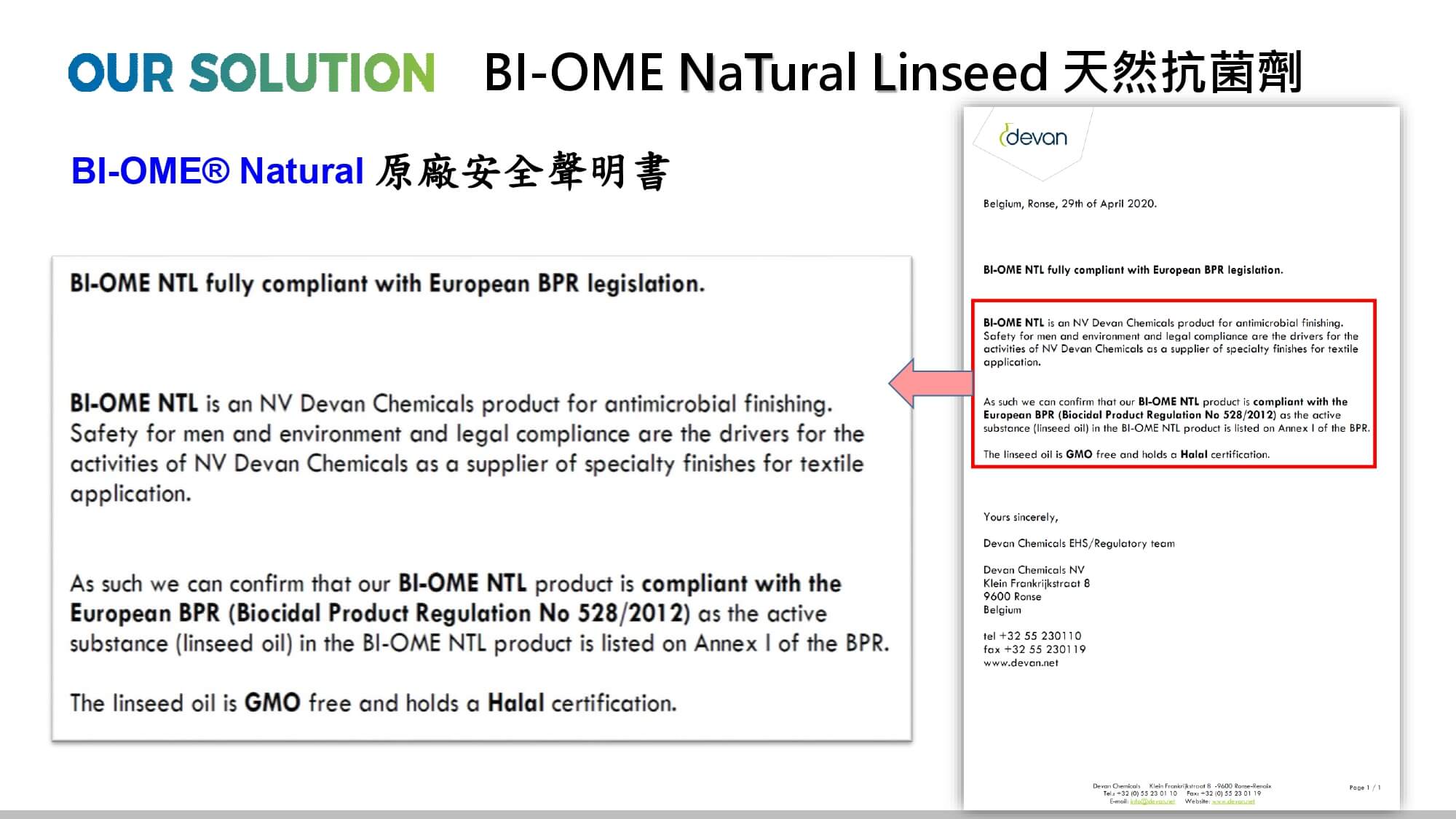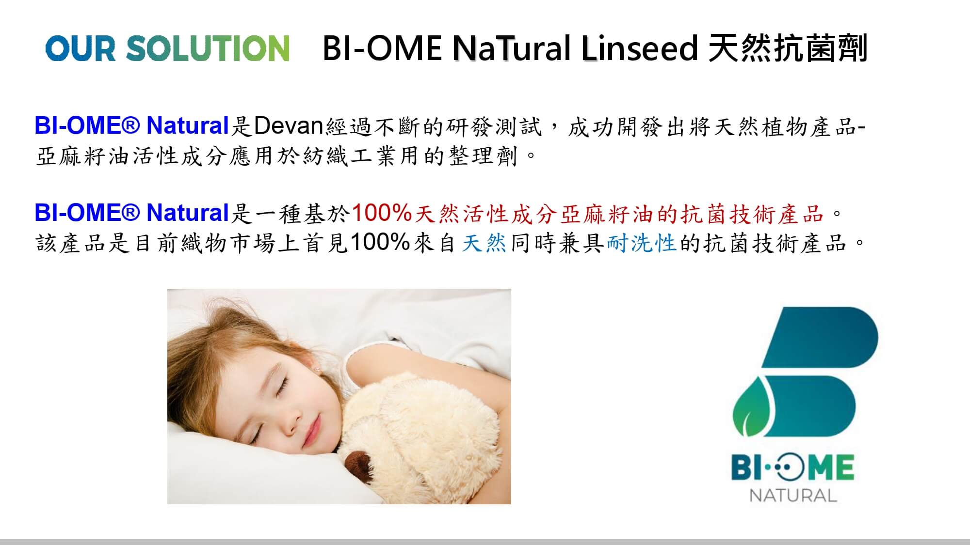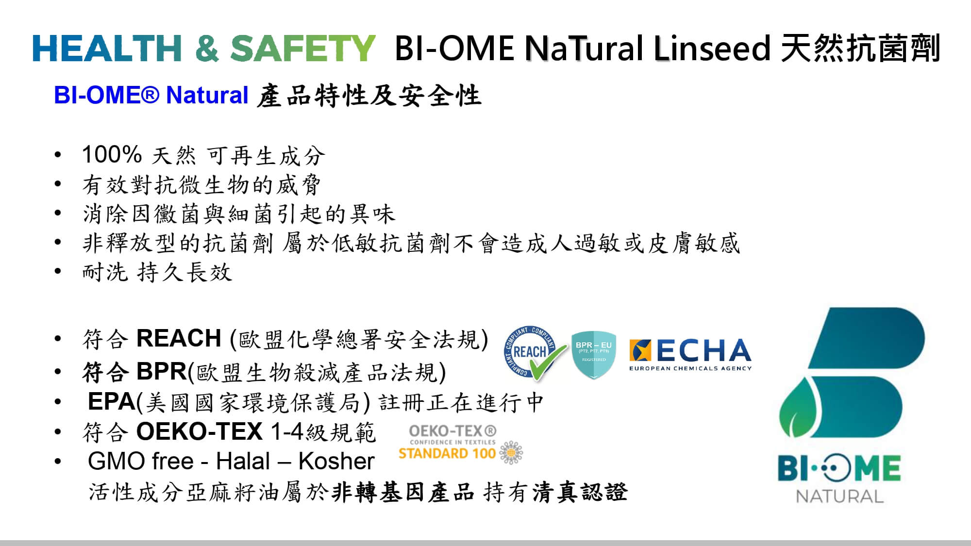BI-OME® Natural 是一種基於 100%天然活性成分亞麻籽油的抗菌技術產品。