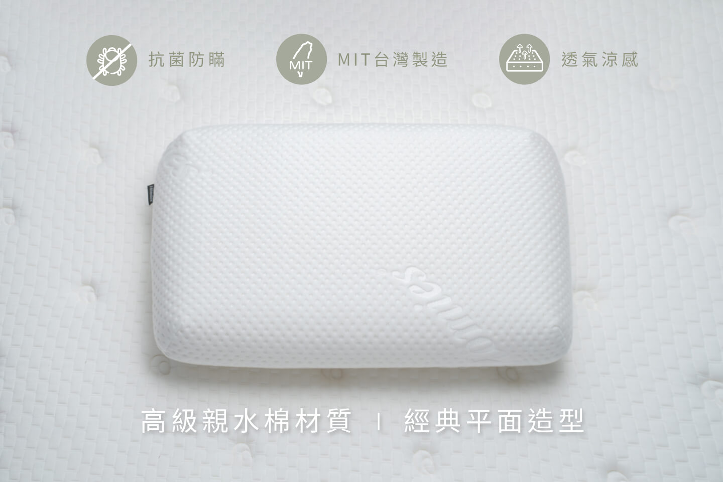眠思枕-平面型,為適應台灣的溼度氣候,製造使用親水棉材質,具有抗菌防蟎、抑制異味分子之功用,同時調節睡眠時人體排放的微量濕氣。親水枕柔軟具撐性,穩固貼合肩膀寬度、並撐托頭頸,使肩膀在側躺時能找到舒適的依靠不壓迫麻痹,適合「習慣仰睡睡姿的族群」,「喜歡柔棉躺感的族群」。